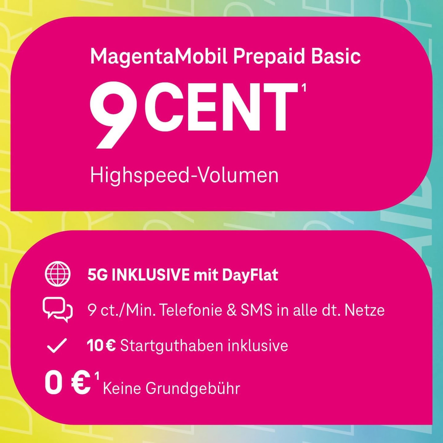Der Tarif der Telekom MagentaMobil Prepaid Basic liefert für vier Wochen einen Tarif ins Telekom Mobilfunknetz mit einem Startguthaben von 10 €. Jede Minute und jede SMS kosten einheitlich 9 Cent. Mit dem Highspeed Surfen per Dayflat können Sie für 1,49 €/24h im besten LTE Max-Netz der Telekom nutzen. Hiermit surfen Sie mit bis zu 300 Mbits/s im Download und 50 Mbit/s um Upload. Der Prepaid Tarif der Telekom hat eine voreingestellte Dayflat mit 50 MB. Nutzen Sie dem MagentaMobil Prepaid Basic Tarif der Telekom bei vorübergehenden Aufenthalten im EU-Ausland ohne weitere Kosten. Ihr Guthaben des MagentaMobil Prepaid Basic Tarifs können Sie über die MeinMagenta App, per Whatsapp oder einen Auflade-Code aufladen. Wenn Sie für Ihren Telekom Tarif zusätzliches Datenvolumen benötigen, können Sie einfach die Dayflat der Telekom für 24 Stunden.