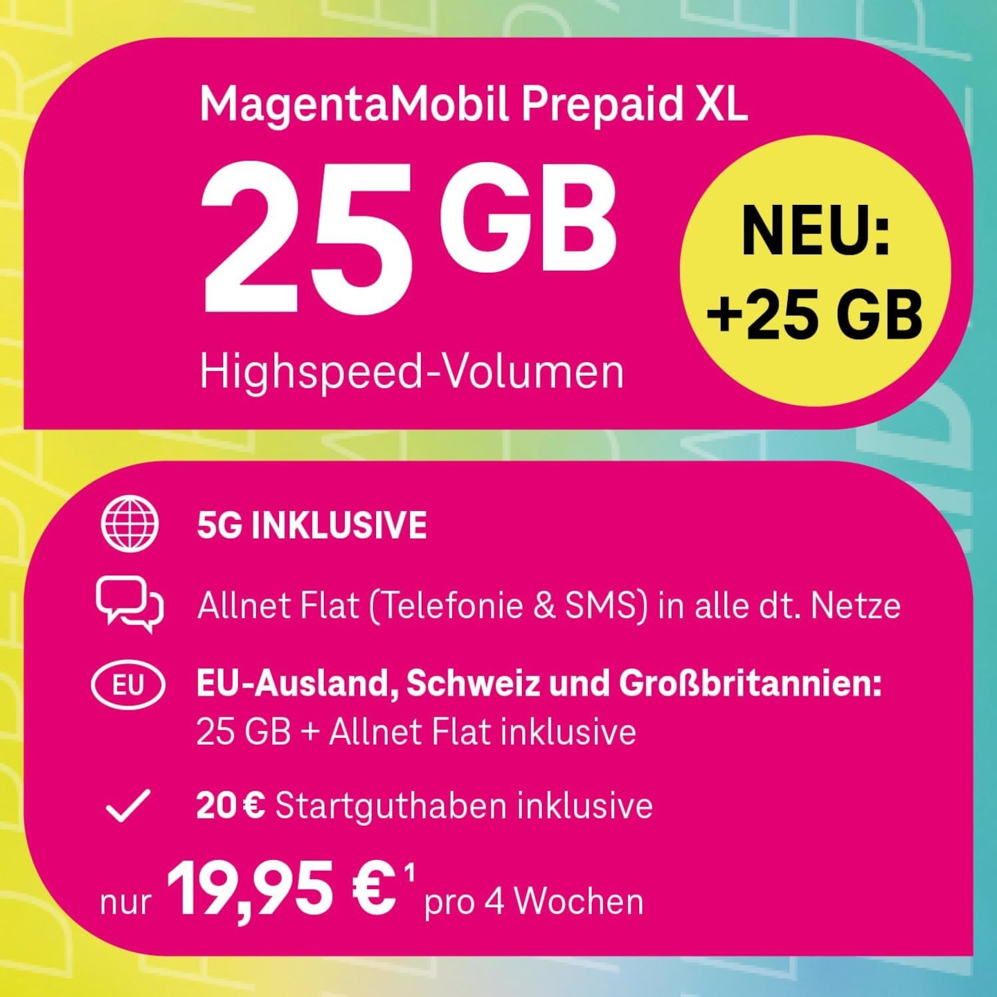 - 50 GB Highspeed-Volumen (1 GB zus. Datenvolumen mit MagentaEINS Prepaid: 50 + 1 GB)